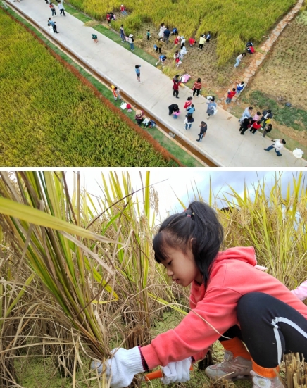 11月12日,市政集團(tuán)建設(shè)的龍州濕地水稻田迎來了豐收季,藍(lán)天白云倒影在清澈見底的湖面,伴隨著五彩繽紛的波斯菊花海搖曳生姿,金黃色的稻谷在秋風(fēng)中散發(fā)著陣陣稻香...城市的繁華與美不勝收的風(fēng)景和諧共生的畫面,吸引了來自龍巖中心城區(qū)中小學(xué)生、家長及眾多市民前來參觀、體驗(yàn)。學(xué)生們利用假期走進(jìn)田間課堂,真切體會(huì)了龍巖“新晉網(wǎng)紅打卡地”的獨(dú)特魅力。