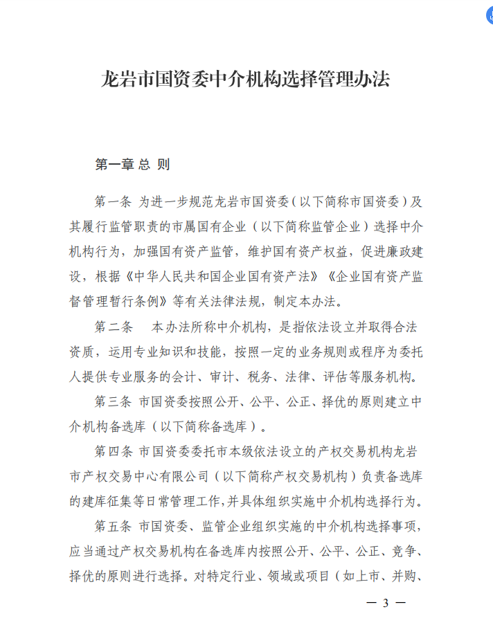 龍巖市國資委關(guān)于印發(fā)中介機構(gòu)選擇管理辦法的通知(龍國資[2020]45號)